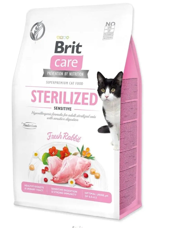 Brit Care Cat Sterilized Sensitive Fresh Rabbit 0.4 kg to sucha karma dla kotów o hypoalergicznej formule, przeznaczona dla dorosłych kotów sterylizowanych z wrażliwym przewodem pokarmowym.