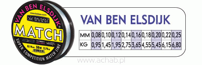 Rezultatem intensywnych poszukiwań przeprowadzonych przez holenderskich profesjonalistów jest żyłka Match Van Ben Elsdijk. Wytrawni sportowcy i zawodnicy potrzebują żyłki, na której mogą polegać w każdej sytuacji. Match Van Ben Elsdijk cechuje się wspaniałą wytrzymałością na węźle oraz wysoką odpornością na ścieranie. Została sprawdzona pod względem skłonności do rozciągania, by upewnić się, że posiada najodpowiedniejszą rozciągliwość, spełniającą najsurowsze wymagania wędkarzy. Match Van Ben Elsdijk nadaje się doskonale zarówno do wędkarstwa wyczynowego jak i rekreacyjnego.