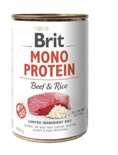 Brit Mono Protein Beef&Rice to pełnoporcjowa karma wilgotna z wołowiną dla psów wszystkich ras. Odpowiednia dla psów z wrażliwym przewodem pokarmowym, alergią i nietolerancją pokarmową.