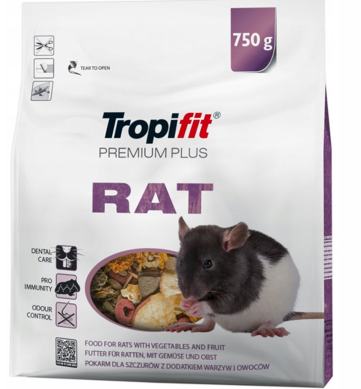 TROPIFIT PREMIUM PLUS RAT Tropifit Premium Plus RAT to najwyższej jakości pełnowartościowy pokarm dla szczurów. Mieszanka została przygotowana przy uwzględnieniu specjalnych potrzeb żywieniowych naszych pupili. Właściwości prebiotyczne wielu składników pokarmu stymulują rozwój prawidłowej flory bakteryjnej jelit i wspierają odporność. Pokarm zawiera lucernę, jabłko, orzechy, indyka, suszone warzywa i owoce oraz aromatyczne zioła. Produkt 100% naturalny, bez dodatku cukru.