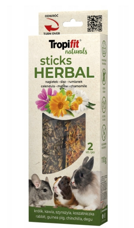 Tropifit Naturals Sticks Herbal to w 100% naturalna przekąska z ziołami dla królików, kawii, szynszyli, koszatniczek i innych gryzoni. Uzyskana w delikatnym procesie suszenia, a nie pieczenia, który pozwala zachować cenne dla zwierząt bioaktywne składniki roślin. Nie zawiera zbóż, cukru, barwników i konserwantów. To zdrowa i smakowita przekąska, która sprawi radość Twojemu pupilowi, ograniczy nudę i stres.